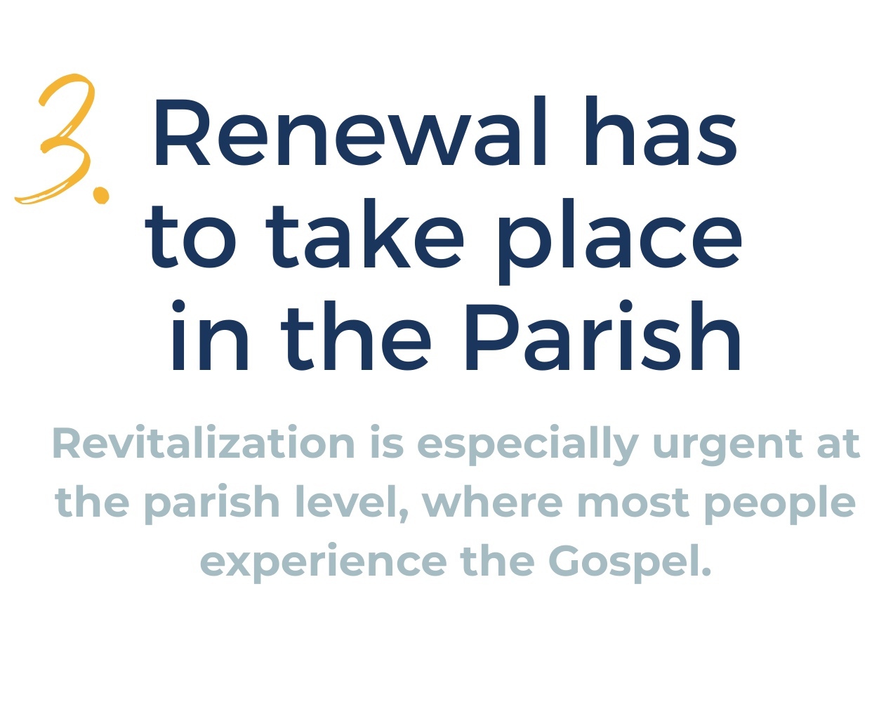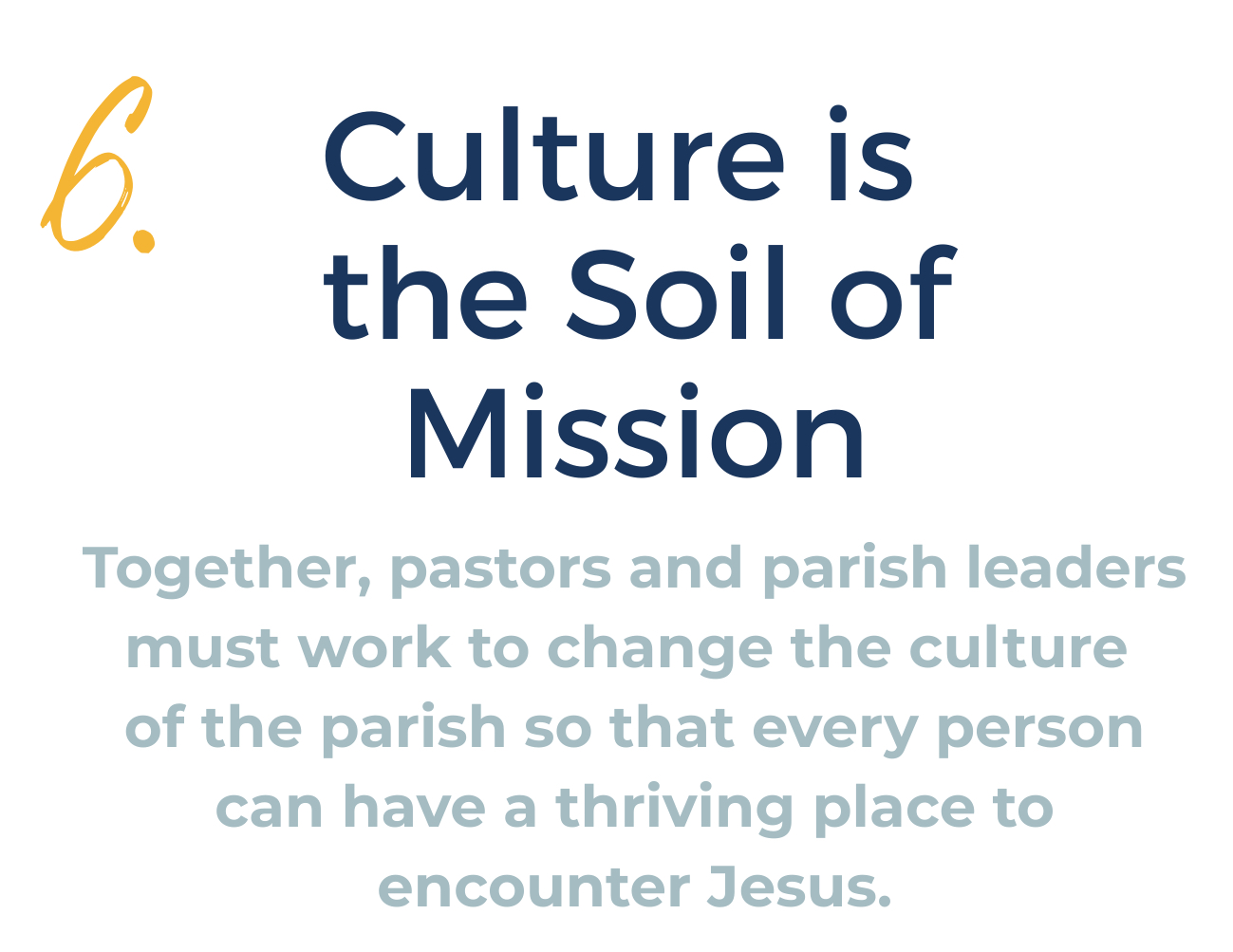 Creating a parish culture where people encounter Jesus, are loved and challenged in community, and are sent on mission. Over time, these foundations help create the kind of parish culture where renewal can take root and mission can flourish.